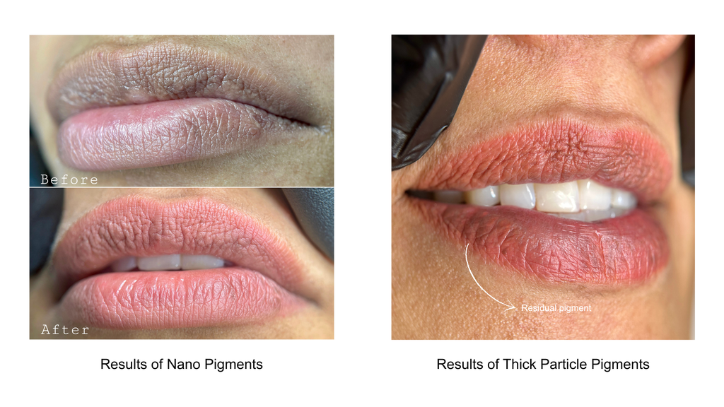 Traditional tattoo pigments are usually around 6–10 microns , while nano pigments are approximately 1–3 microns . The smaller particle size allows the pigment to blend more evenly with the lip tissue , creating a softer, more natural-looking result rather than sitting heavily in the skin.
