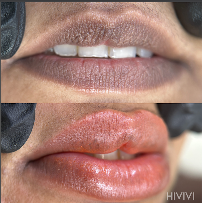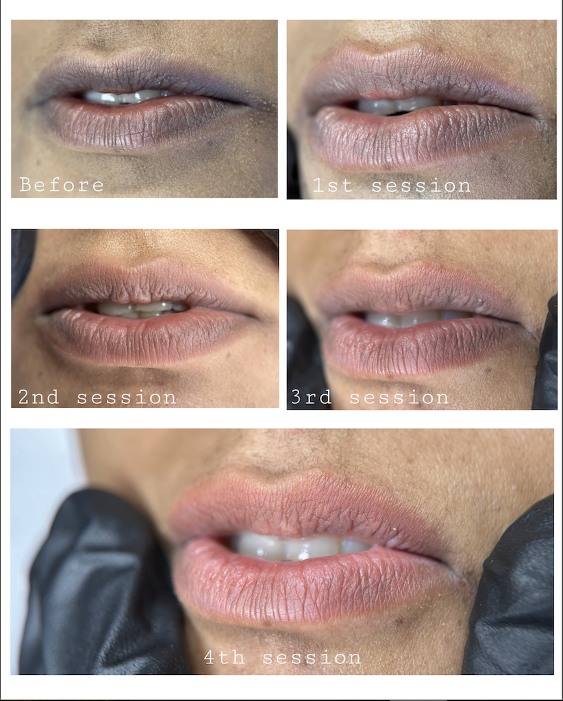If your lips are heavily pigmented, it’s normal that the change is hard to notice in the first 2–3 sessions—but with patience, each layer slowly reveals a softer, more even tone. This staged approach ensures lips heal smoothly and stay soft, shiny, and naturally rosy without damaging the delicate lip texture.