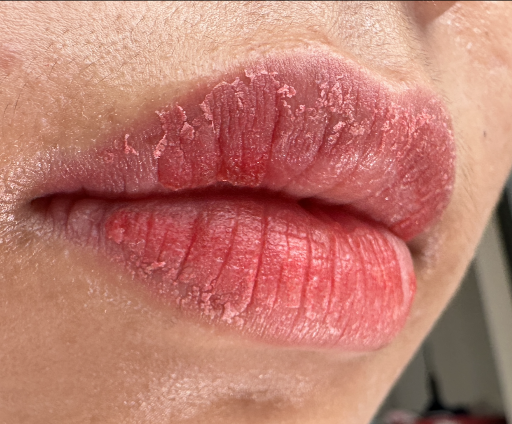 When the scab peels off (around day 3–4), the lips often look darker and even more pigmented than before, which makes many clients feel worried or panicked. This stage is temporary and part of natural healing.